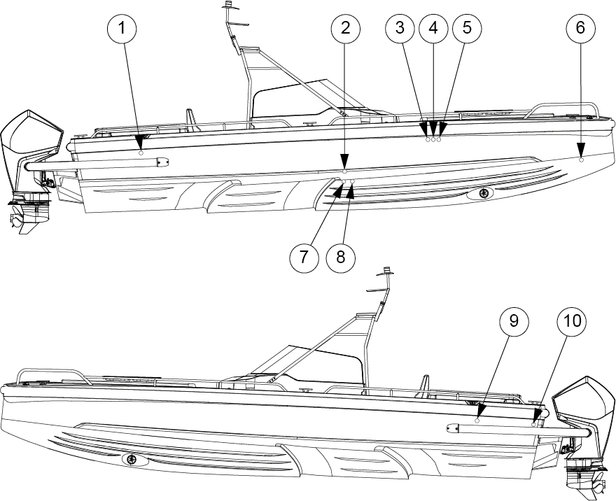 Die Abbildung zeigt die Luken, die während der Fahrt oder wenn das Boot unbemannt ist, geschlossen bleiben müssen.