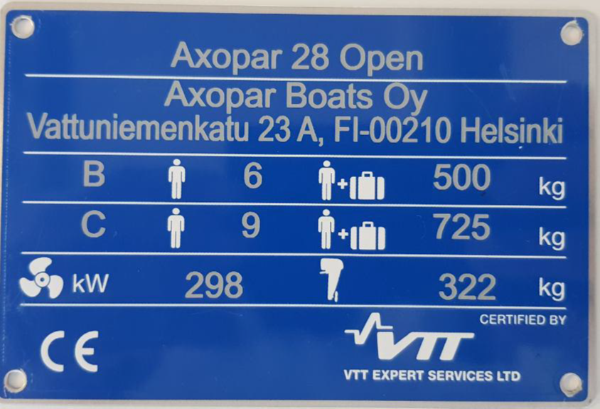 Eurofins Expert Services Oy has inspected that the boat fulfills the Recreational Boat Directive and related standards' requirements.