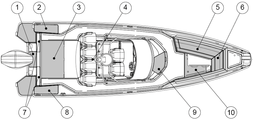 The figure shows the hatches and seacocks that must be kept closed when the boat is left unmanned. Keep hatches closed also while underway.