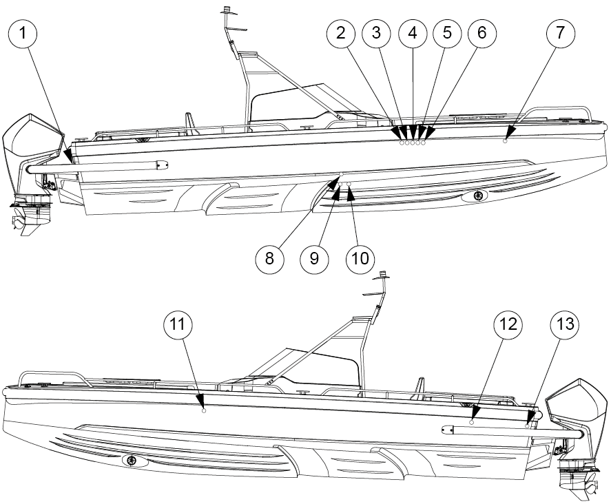 The figure shows the seacocks and inlets through the side. Always check in the spring when launching that the inlets through the side and bottom are tightly closed.