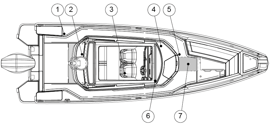 The tank is located under front deck. The pump and hydraulic accumulator are next to the tank. The fresh water tank is filled via the inlet pipe on the foredeck.