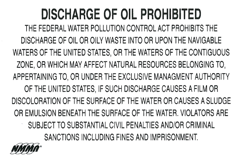 Discharge of oil prohibited The federal water pollution control act prohibits the discharge of oilor oily waste into or upon the navigable waters of the United States, or the waters of the contiguous zone, or which may affect natural resources belonging to, appertaining to, or under the exclusive management authority of the Unites States, if such discharge causes a film or discoloration of the surfaces of the water or causes a sludge or emulsion beneath the surface of the water. Violators are subject to substantial civil penalties and/or criminal sanctions including fines and imprisonment. |