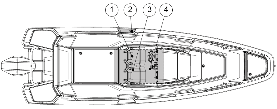 • Recuerde que no está permitido almacenar combustible en espacios no diseñados específicamente para ello. Dado que no hay espacio de almacenamiento ventilado en este barco, las latas de combustible de repuesto deben almacenarse en cubierta.