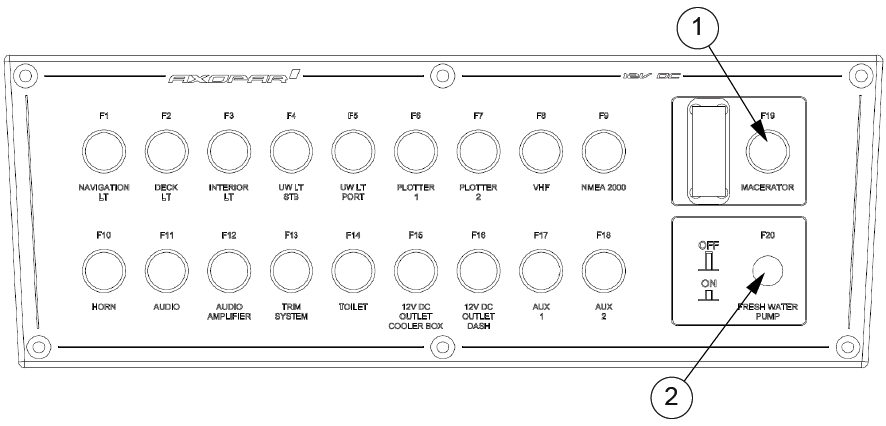 Der Sicherungskasten verfügt über einen kombinierten Schalter und eine Sicherung für die Zerhackerpumpe und die Frischwasserpumpe. Der Sicherungskasten verfügt außerdem über einen 12-V-Ausgang.