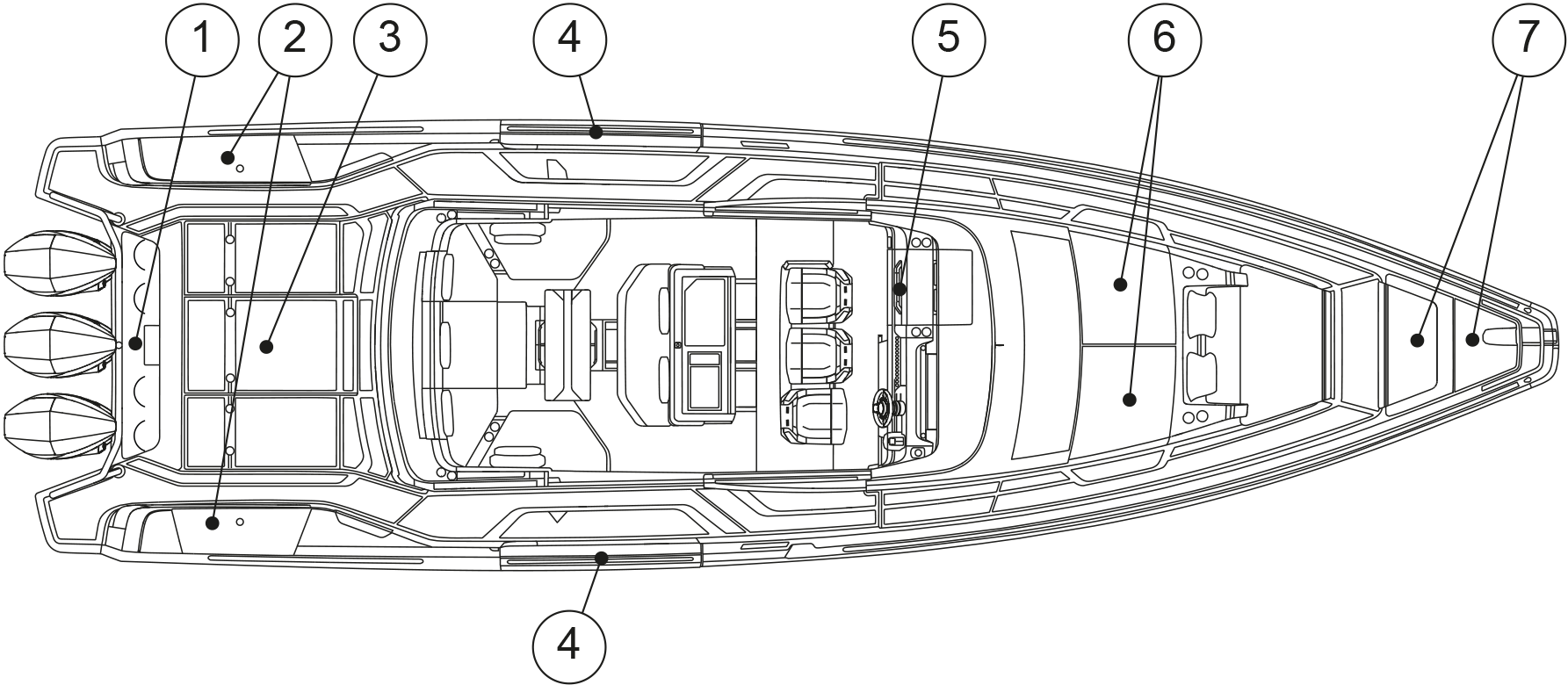 The figure shows the hatches that must be kept closed while under way or when the boat is left unmanned.