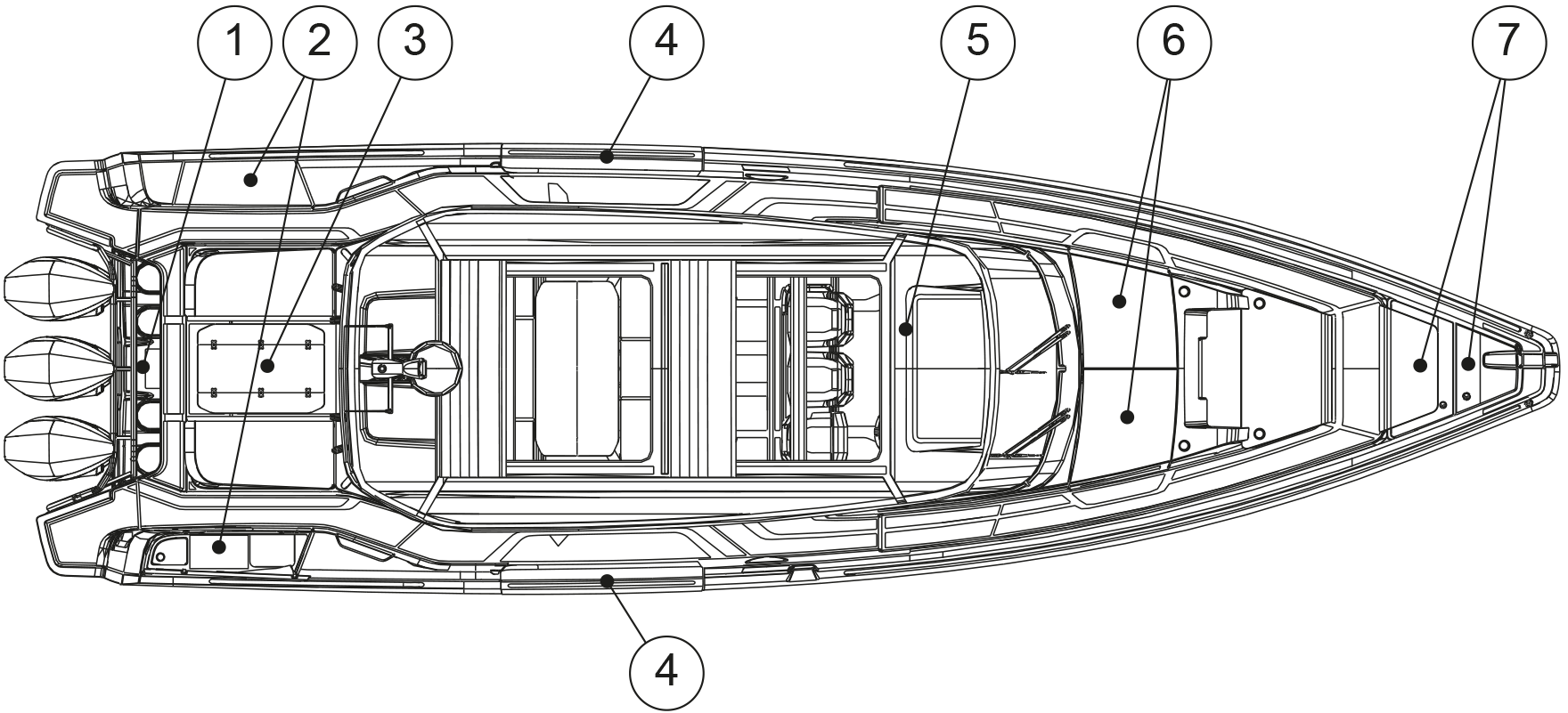 The figure shows the hatches that must be kept closed while under way or when the boat is left unmanned.