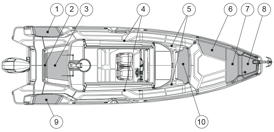 The figure shows the hatches and seacocks that must be kept closed when the boat is left unmanned. Keep hatches closed also while underway.