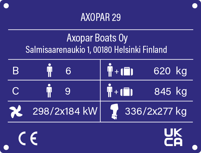 Boat carries UKCA marking (shown in right bottom corner of CE plate) to indicate that it complies with the UK Recreational Craft Regulations.