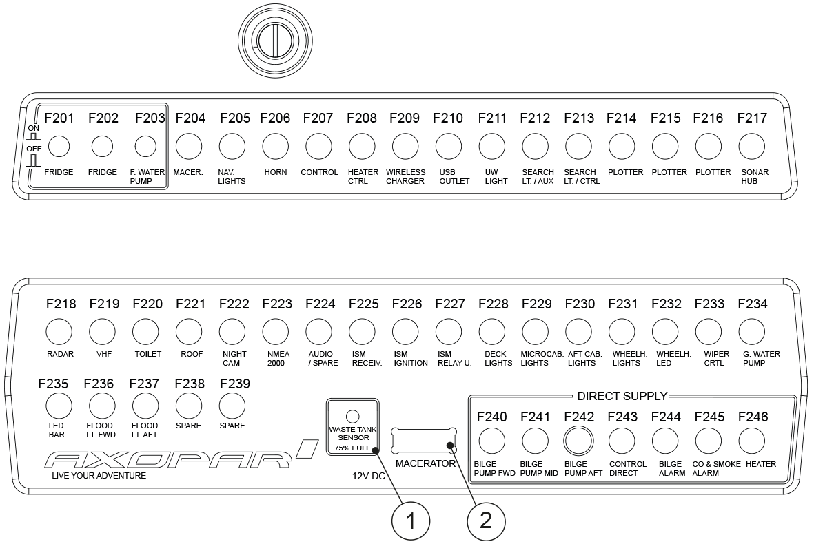 The fuses are in the form of trip switches that break the circuit and spring up when tripped. Do not reset the switch before you have found out the reason for the breaker tripping. After that press the switch back down.