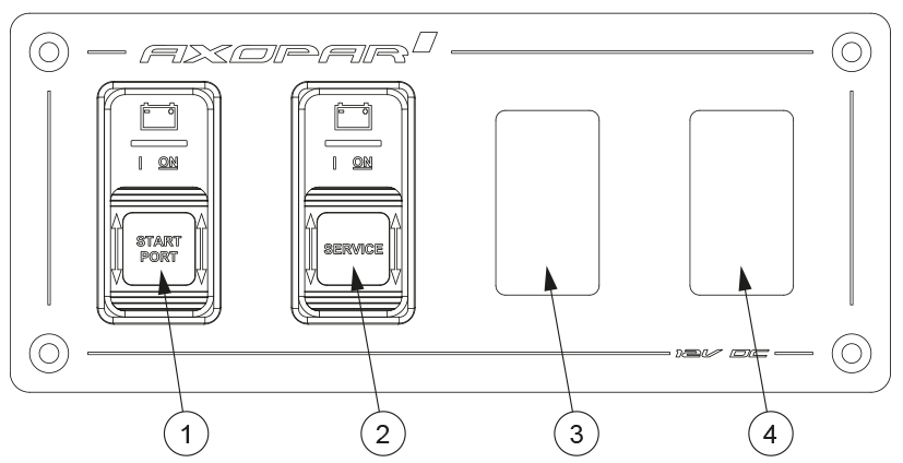 The design drawing of the boat’s electrical system is presented in appendix Electrical diagrams. The main switch is located under the aft seat. In the main switch panel, there are direct supply switches for critical equipment and main switches for the start batteries, the service battery and the Aux battery.