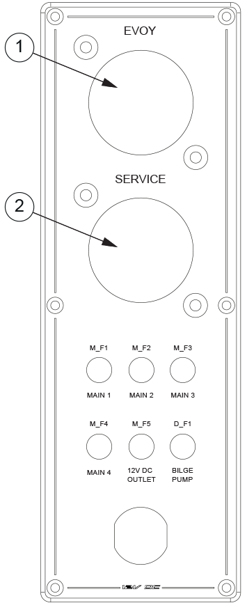 The design drawing of the boat’s electrical system is presented in appendix Electrical diagrams. The main switch is located under aft seat. In the main switch panel are direct supply switches for critical equipment and main switches for the motor system (Evoy) battery, the service battery and the Aux battery.