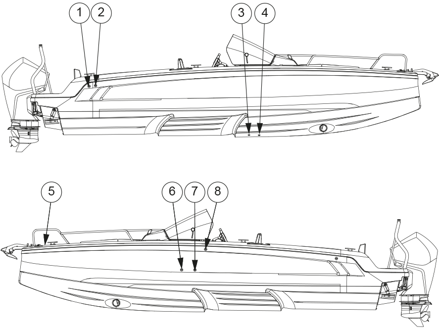 There are several inlets through the boat that include valves for opening and closing such inlets. It is recommended to keep these inlets closed if the boat is out of use for a long time, and to open them again when the boat is used again. If the boat is lifted out from water or in rainy conditions, inlets should be kept open.