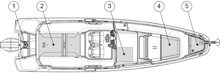 The figure shows the hatches that must be kept closed while driving or when the boat is left unmanned.