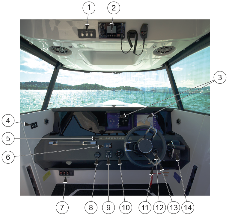 The location and quantity of the devices depend on what optional equipment and engine models have been chosen. See the device manuals for further information on the devices.