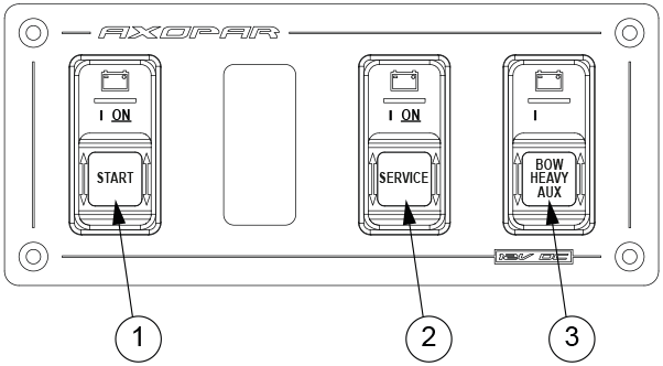 Current is fed to the engine by turning the Start switch to the On position. The current feed to other equipment is achieved by turning the Service switch to the On position, and feed to the bow thruster and windlasses is achieved by turning the Aux switch to the On position.