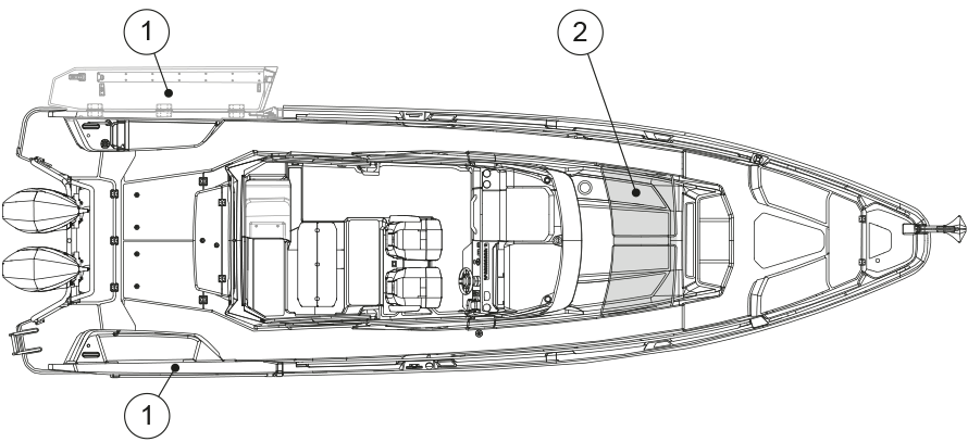 Båten erbjuder flera däckalternativ. Utrustningens och de tekniska komponenternas upplägg kan variera beroende på de tillbehör som väljs.