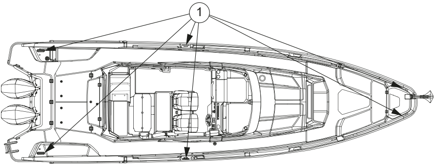 Fästpunkter (eller knapar) finns på aktern, midskeppet och fören.