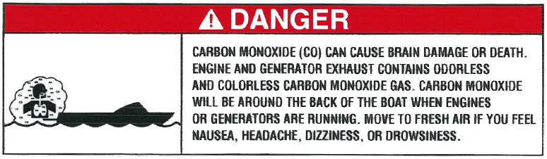 Fara Kolmonoxid (CO) kan orsaka hjärnskador eller dödsfall. Motor- och generatoravgaser innehåller luktfri och färglös kolmonoxidgas. Kolmonoxid kommer att finnas bak i båten när motorer eller generatorer är igång. Flytta till frisk luft om du känner dig illamående, har huvudvärk, yrsel eller känner dig dåsig. |