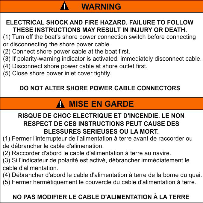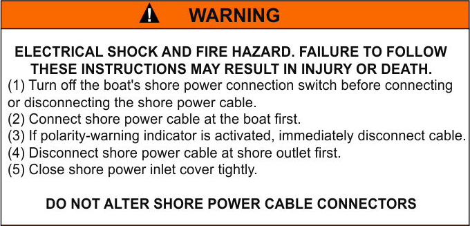 Varning Risk för elektrisk stöt och brand. Underlåtenhet att följa dessa instruktioner kan leda till skada eller dödsfall. (1) Slå ifrån båtens landströmbrytare innan du ansluter eller kopplar bort landströmkabeln. (2) Anslut landströmkabeln till båten först. (3) Om polaritetvarningsindikatorn är aktiverad, koppla omedelbart bort kabeln. (4) Koppla först bort landströmkabeln vid landuttaget. (5) Stäng locket till landströmuttaget ordentligt. Ändra inte kontakterna i landströmkabeln |