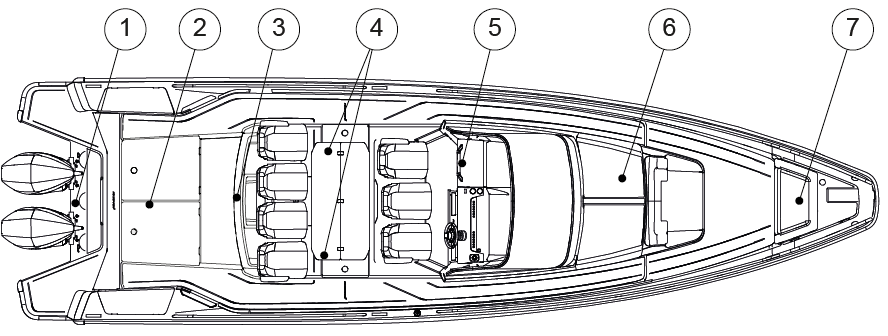 The figure shows the hatches that must be kept closed while under way or when the boat is left unmanned.