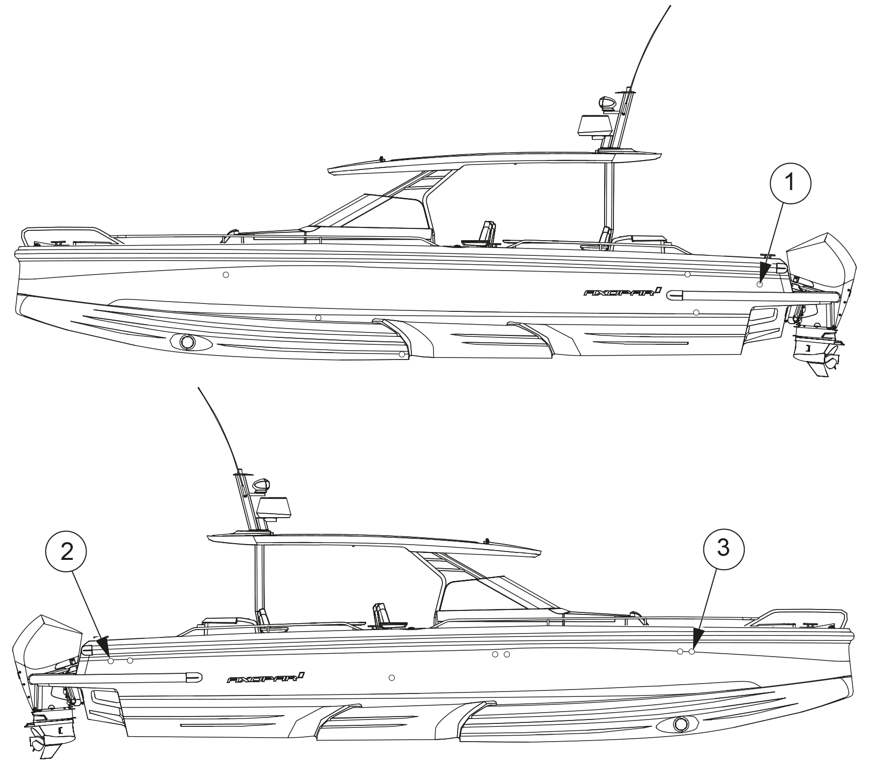 The figure shows the bilge pump outlets through the side. Always check in the spring when launching that the outlets through the side and bottom are tightly closed.