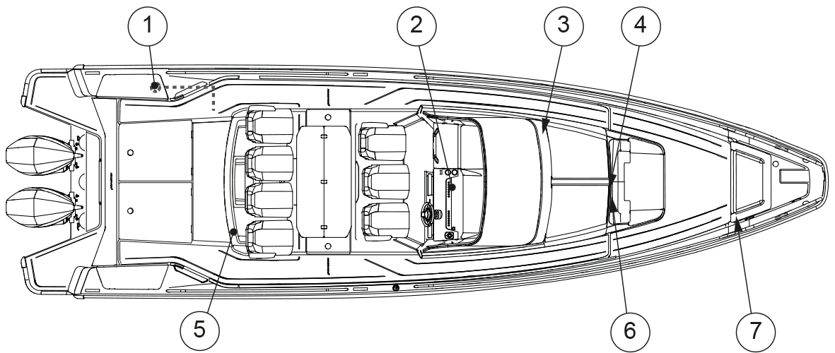 The tank and pump are located under the front deck. The fresh water tank is filled via the filling cap inside the fore anchor hatch.