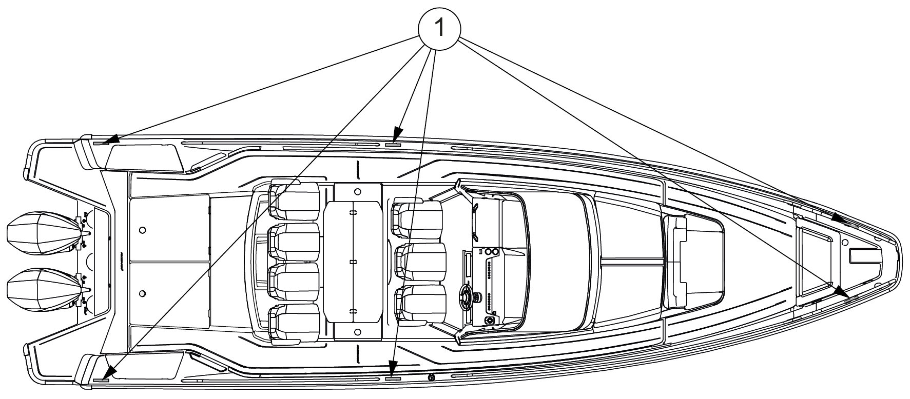 Fästpunkter (eller knapar) finns på aktern, midskeppet och fören.