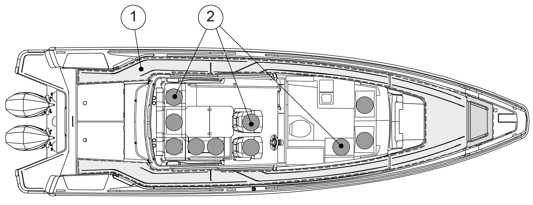 If the sun deck cushions or the front deck table are in place, observe the maximum speed of 15 knots to avoid the cushions or table detaching at speed or in high waves.