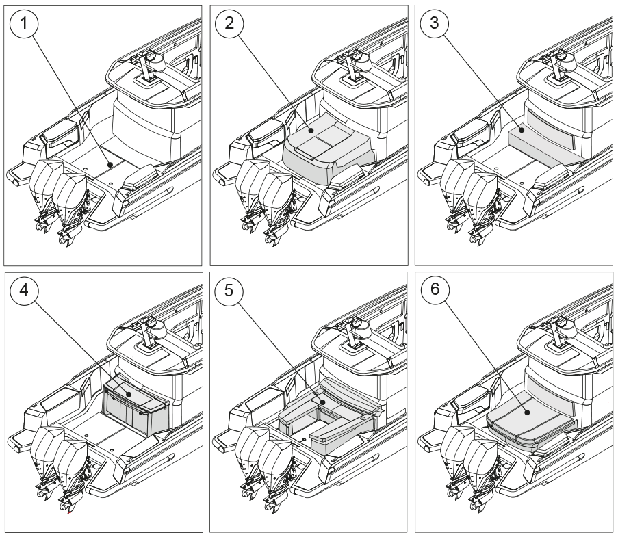 The boat has several deck options. The layout of the equipment and the technical components may vary depending on the selected accessories.