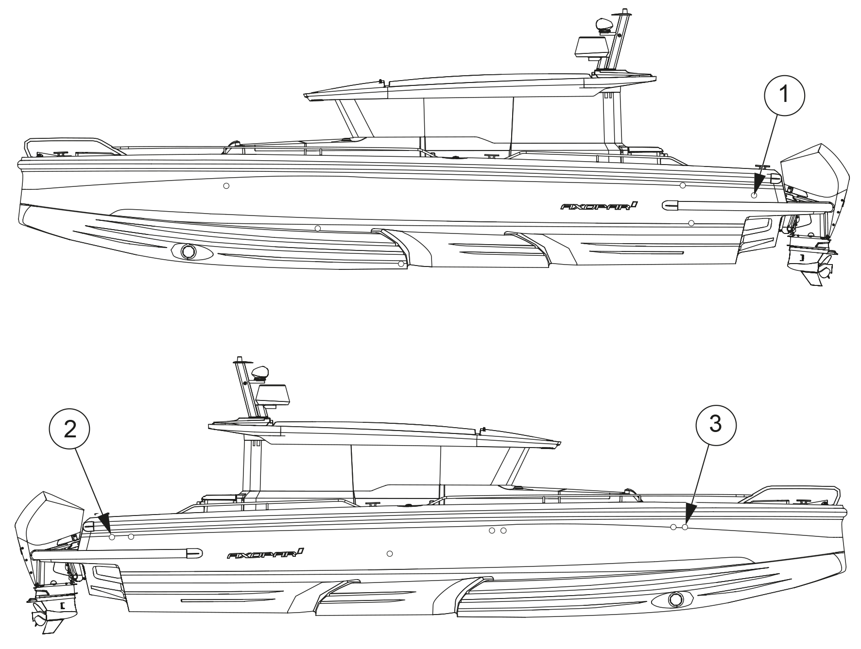 The figure shows the bilge pump outlets through the side. Always check in the spring when launching that the outlets through the side and bottom are tightly closed.