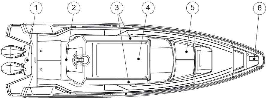 The figure shows the hatches that must be kept closed while under way or when the boat is left unmanned.