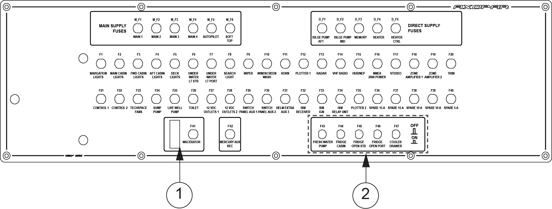 The fuse panel is located on the aft wall of the front cabin. The panel has a combined switch and fuse for macerator, fresh water pump and fridge. The fuse panel also has a 12 V output.