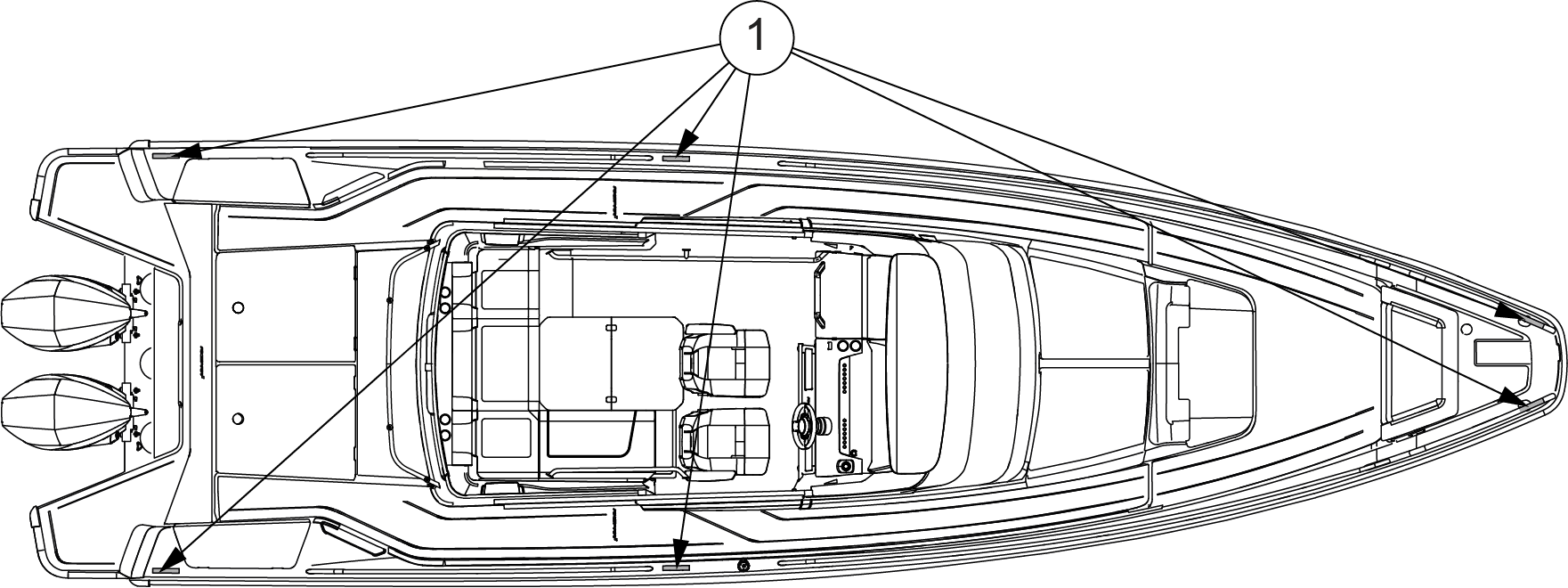 Fästpunkter (eller knapar) finns på aktern, midskeppet och fören.